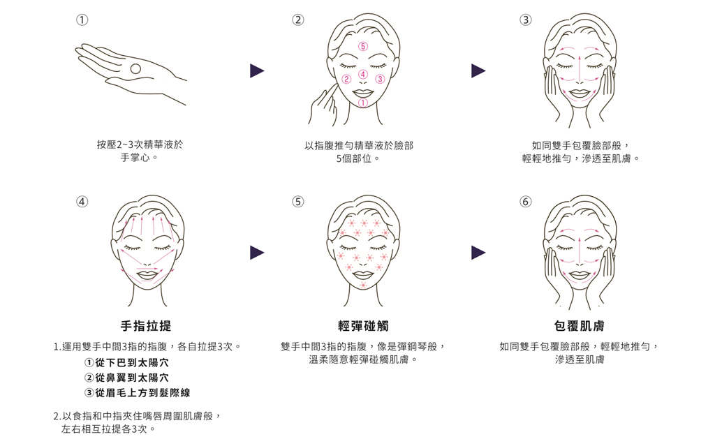 使用黑珍珠精萃活膚精華液進行『速效暖肌法』30 秒按摩效果,活化肌膚。